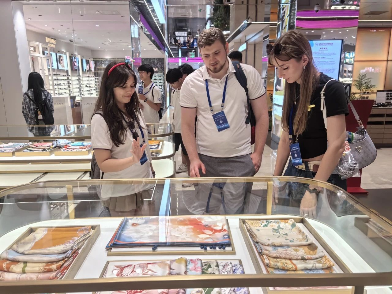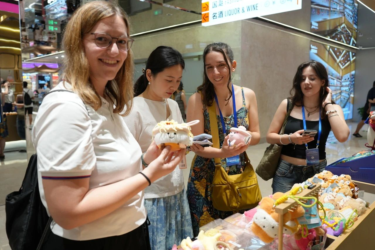 國際青年們在志愿者陪同下,迫不及待地開啟了在免稅店的探索之旅。免稅店的“中國美學長廊”瞬間化身為一座濃縮的文化寶藏地,吸引著他們駐足流連。