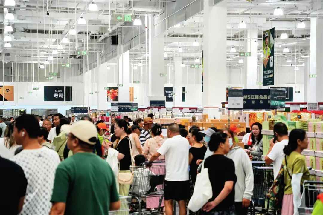 大門剛一開啟,等待已久的人潮便涌入店內。不到一小時,多個貨架被買空,手推車堆成了小山,收銀臺前排起長龍。開業一小時后,排隊進店的市民熱情依然高漲。這家定位家庭客群的會員店,用一場貨真價實的“搶購潮”,宣告其登陸江城市場。